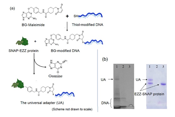 (a) Scheme of forming the universal adapter (UA) using a self-catalyzing enzyme (SNAP). Thiol-modified DNA tag was first conjugated to maleimide-benzyl guanine (BG) that served as the substrate for the SNAP enzyme. This BG-modified DNA tag was then linked to EZZ protein through SNAP catalysis to create the universal adapter (UA), a bifunctional protein-DNA hybrid molecule. (b) Confirmation of UA on 4-20% SDS-PAGE gel electrophoresis. The same gel was first stained with GelRed dye (left) to visualize DNA products and then stained with Comassie Brilliant Blue (right) to visualize protein products. Only UA with both DNA and protein components is visualized in both cases. Lane 1. UA; Lane 2. thiol-modified DNA only; 3. EZZ-SNAP protein only.