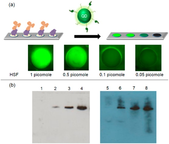 Figure 3. DNA-based protein detection system with different reporter molecules. (a) Protein detection using dot blot technique with quantum dots. Quantum dots were used to replace DNA nanobarcodes in our IgG nano-barcodes. HSF protein on PVDF membrane was recognized by its specific antibody and then labeled with UA-QDs. (b) Comparison of WB detection of HSF protein using DNA-modified HRP with IgG-UA (IgG-UA-HRP) (left) and traditional HRPmodified secondary antibody (right). Lanes 1−5, HSF protein detection using our IgG-UA-HRP at 0.25, 0.5, 0.75, 1, and 2 pmol; lanes 6−9, HSF protein detection using traditional WB method which utilized the HRP-modified secondary antibody at 0.25, 0.5, 0.75, and 1pmol.