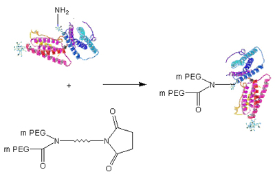 巰基蛋白的設計可專為PEG鍵合考慮,在不影響蛋白本身生物活性的情況的下,通過在適當位置添加一個“無效”基團從而和PEG保護試劑結合,可充分發(fā)揮生物基因工程的優(yōu)勢,從而保證藥效的更有效發(fā)揮。