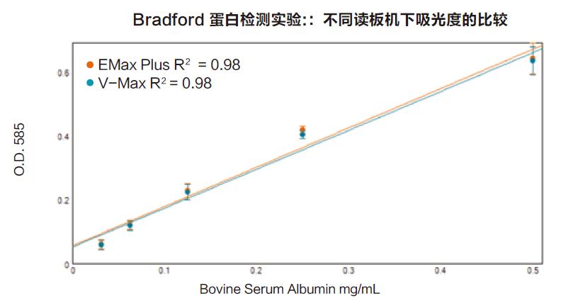 使用伯樂公司的Bradford蛋白定量檢測試劑盒。以牛血清白蛋白標(biāo)品來制作一條標(biāo)準(zhǔn)曲線,加入96孔板中且每個濃度下有三個復(fù)孔。將考馬斯亮藍(lán)G-250染料按1:4稀釋后加入到蛋白樣本中。孵育30分鐘后,分別在EMax Plus和VMax兩臺讀板機上檢測585nm波長下的吸光度。最后,應(yīng)用SoftMax® Pro軟件扣除背景后并生成一條標(biāo)準(zhǔn)曲線(圖1)。通過比較發(fā)現(xiàn)兩臺讀板機上得出的R2結(jié)果都是0.98。曲線的線性部分也和試劑盒中對標(biāo)準(zhǔn)曲線的描述相同。