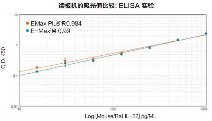 圖2. 使用R&D公司的小鼠/大鼠IL-22 ELISA定量檢測試劑盒,比較EMax Plus和EMax兩臺讀板機在光吸法檢測結(jié)果上的差異。標(biāo)準(zhǔn)曲線的制備及雙抗夾心ELISA實驗過程都使用了MultiWash+洗板機單列清洗模式。發(fā)現(xiàn)在兩臺讀板機上的ELISA檢測結(jié)果,即兩條標(biāo)準(zhǔn)曲線幾乎相同。
