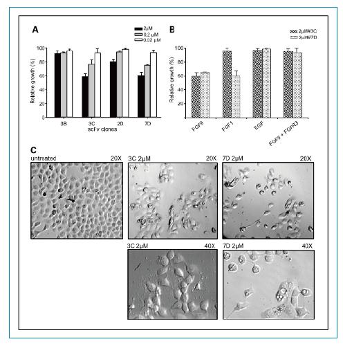 圖5. FGFR3特異性的scfvs抗體對RT112細胞增殖的抑制。A. 不同濃度的3B, 3C, 2D和7D scFvs抗體對RT112細胞的抑制活性。C. 2 umol/L 3C and 7DscFvs處理細胞后,細胞數(shù)目和形態(tài)的分析。