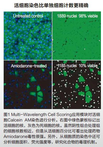 活性染色(例如Calcein AM)可以用來粗略的檢測活細胞中的化合物毒性。首先用各種化合物對肝細胞進行72小時處理并染色。通過ImageXpress Micro XL 系統(tǒng)的10倍物鏡我們可以得到肝細胞的圖像, 然后我們用MetaXpress軟件的Multi-Wavelength Cell Scoring應用模塊對活細胞的整個核區(qū)域(Hoechst復染色)和細胞質區(qū)域(Calcein AM)進行分析(圖1)。
