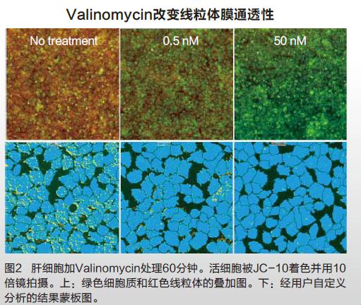 線粒體去極化是缺氧損傷和氧化應激的早期標志。我們可以用JC-10對線粒體膜電位進行檢測,雖然橙色的J-aggregates肉眼可見,但是對于膜去極化來說,這種染料可以進入到細胞質中并發(fā)出特定的熒光波長。在用ImageXpress Micro XL系統(tǒng)成像前先用化合物處理肝細胞60分鐘并用JC-10染色。系統(tǒng)的自定義模塊可以對健康線粒體中保存的染料和滲透到細胞質中的染料分別定量。通過分析這兩類熒光染色信號強度的比率我們可以得到比之前單一檢測更可靠的數(shù)據(圖2)。