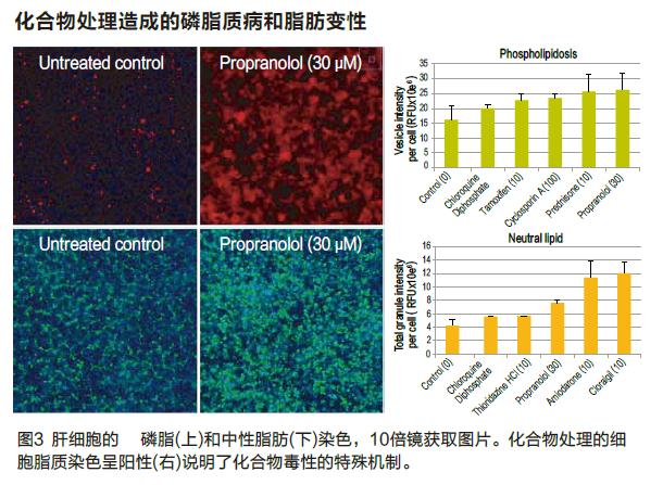 一些藥物會引起磷脂質病和脂肪變性,這是由脂肪代謝紊亂引起的組織中過多的磷脂質和中性脂肪聚集造成的。我們可以用成像的方法對肝細胞中的磷脂質和中性脂肪的分布進行檢測,這一檢測可以精確到單細胞水平。圖3我們列舉的實驗中肝細胞被種在384孔板24小時后,用待測化合物處理孵育了4天。