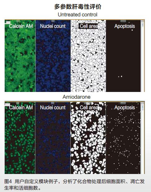 MetaXpress軟件中的自定義模塊編輯器可以讓科學家們針對自己感興趣的參數(shù)進行復雜的分析。這種自定義模塊已被證明可以有效的定量細胞大小,形狀,不同細胞的總數(shù)以及凋亡情況(圖4)。這些模塊也可以應用在圖像處理上,還可以用MetaXpress.PowerCore. High Content Distributed Image Analysis Software對大量樣本進行高通量篩選分析。