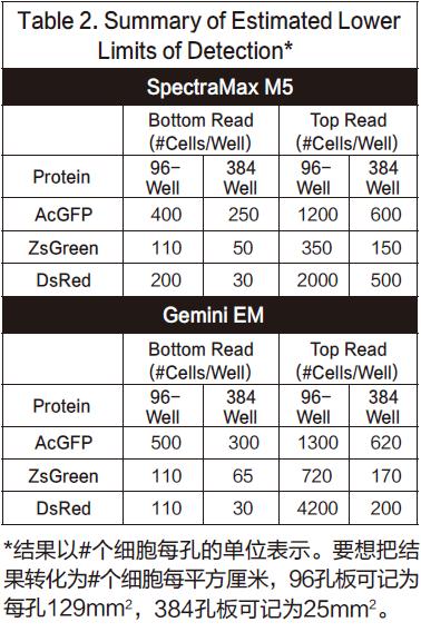 在本次實驗中,ZsGreen和DsRed細(xì)胞系在底讀模式都有著相似的檢測限,而且兩者都比AcGFP細(xì)胞系的檢測下限低3到4倍。本次實驗一共重復(fù)了三次,但是DsRed實驗結(jié)果并不是每次都能表現(xiàn)的足夠好。在一次實驗中,它的檢測下限近似于AcGFP,但是在另一次實驗中,它的檢測下限又會很高。我們將這些區(qū)別歸結(jié)于不同細(xì)胞系的通道數(shù)目不同。(伴隨著一個成功的通道,細(xì)胞就會變得越暗)DsRed細(xì)胞系在實驗開始階段比其它細(xì)胞系長得快,所以在第一次實驗中,它比其它細(xì)胞系多2-4倍的通道,結(jié)果就顯然不夠理想。