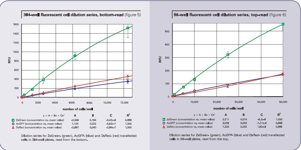 采用底讀得到的細(xì)胞稀釋結(jié)果詳見圖4(96孔板)和圖5(384孔板)。頂讀結(jié)果詳見圖6(96孔板)和圖7(384孔板)。ZsGreen細(xì)胞系(上面的曲線)的亮度是其它兩種細(xì)胞系的將近3.5倍。盡管DsRed細(xì)胞系的結(jié)果暗于ZsGreen,但兩種細(xì)胞系的檢測靈敏度卻相近。(列表2的下圖),因為背景值低于DsRed的波長。