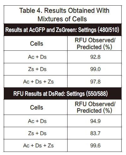 在本次實驗中,我們在一個96孔板里混合了多種細(xì)胞,保證每個孔大約50,000個細(xì)胞。因此,如果是1:1混合,那么每種細(xì)胞會有25,000個。如果是1:1:1混合,那么每種細(xì)胞將有1 6 , 7 0 0 個。實驗板分別用480/510nm(AsGFP和ZsGreen的優(yōu)化結(jié)果)和550/588nm(DsRed設(shè)置)的激發(fā)和發(fā)射來檢測。觀察到的RFU值與預(yù)測值接近。結(jié)果總結(jié)如下。結(jié)果顯示,AsGF P和ZsGreen可以和DsRed一起檢測,反之亦然。(見圖表4)
