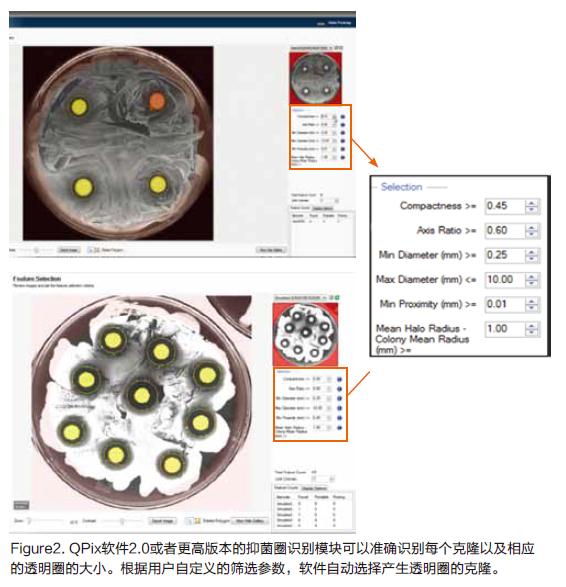 使用QPix400系統(tǒng)的抑菌圈識(shí)別軟件模塊對(duì)平板進(jìn)行白光成像,如圖2所示,軟件識(shí)別具有透明圈的克隆。高級(jí)的軟件算法應(yīng)許用戶自定義篩選參數(shù),篩選并挑取符合特定要求的抑菌圈,如克隆大小、抑菌圈直徑、克隆直徑、軸比以及克隆邊緣形狀等(圖2)。