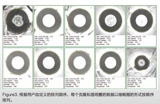 接下來,軟件選擇的可以產(chǎn)生抑菌圈的克隆以縮略圖的形式排列。克隆可以以多種順序進(jìn)行排列,比如總的透明區(qū)域大小、克隆大小、軸比、邊緣形狀等(圖3)。軟件自動(dòng)列出了每個(gè)產(chǎn)生抑菌圈克隆的詳細(xì)定量數(shù)據(jù),方便隨時(shí)查看。