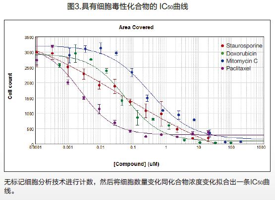 將Hela細(xì)胞按5000/孔的密度鋪在384孔板中并培養(yǎng)過夜。第二天使用幾種可誘導(dǎo)細(xì)胞死亡的化合物處理72小時(shí),利用SpectraMax MiniMax細(xì)胞成像系統(tǒng)進(jìn)行分析。無標(biāo)記分析法計(jì)算處理后活細(xì)胞數(shù)量,并用Soft-Max Pro軟件繪制出其IC50曲線。結(jié)果顯示細(xì)胞對化合物的反應(yīng)情況無需通過破壞性強(qiáng)的染色和脫色步驟也可被準(zhǔn)確的檢測到(圖3)。