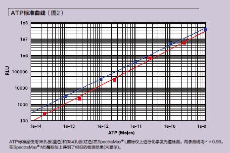 ATP標(biāo)準(zhǔn)樣品用培養(yǎng)基制備,濃度范圍從100 fmol/孔到1nmol/孔(96孔板),或25 fmol/孔到250 pmol/孔(384孔板),按上述同樣體積加入微孔板中。空白對照孔加入不含ATP的培養(yǎng)基。適量CellTiter-Glo試劑加入每孔,并按上述步驟孵育。