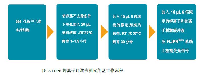 FLIPR 鉀離子通道檢測試劑盒(Molecular Devices cat. #R8222) 含有Tl+敏感染料、屏蔽染料、200 mM K2SO4、50 mM Tl2SO4、5X 不含氯離子的緩沖液以及HBSS + 20 mM HEPES 緩沖溶液。每個(gè)包裝的試劑盒可以完成10 塊96,384,或1536 孔板。實(shí)驗(yàn)檢測流程見圖2。