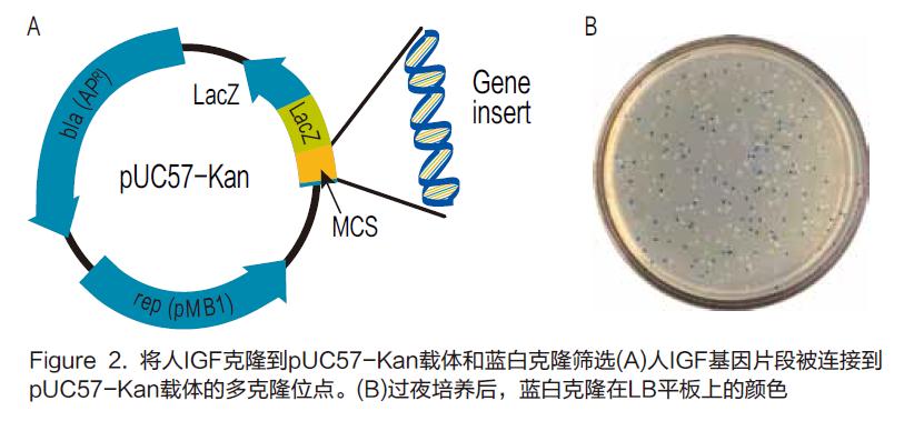 作為實(shí)驗(yàn)?zāi)P,人胰島素樣生長(zhǎng)因子(IGF)基因被克隆到pUC57-Kan載體的多克隆位點(diǎn)(Figure 2A)。然后,將載體和基因片段(Human IGF)連接產(chǎn)物轉(zhuǎn)化E . coli 化學(xué)感受態(tài)(One Shot® TOP10, Life Technologies)。最后將轉(zhuǎn)化的細(xì)菌涂布到含有卡那霉素、IPTG和X-gal的LB平板,37度過夜培養(yǎng)。含有載體和插入片段或沒有插入片段的克隆,分別顯示為白色和藍(lán)色克隆(Figure 2B)。
