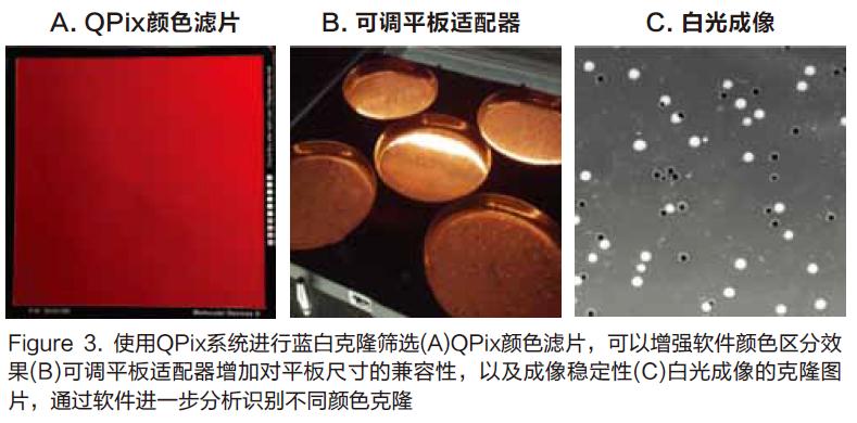 生長(zhǎng)好的藍(lán)白克隆平板放入可調(diào)平板適配器,然后一起放置到機(jī)器成像平臺(tái)上,平板和適配器下面為QPix顏色濾片(Figure 3A);可調(diào)適配器上的彈性插銷,可以壓緊培養(yǎng)皿平板,確保成像過程中不會(huì)移位(Figure 3B);QPix420白光下對(duì)平板成像(Figure 3C)。