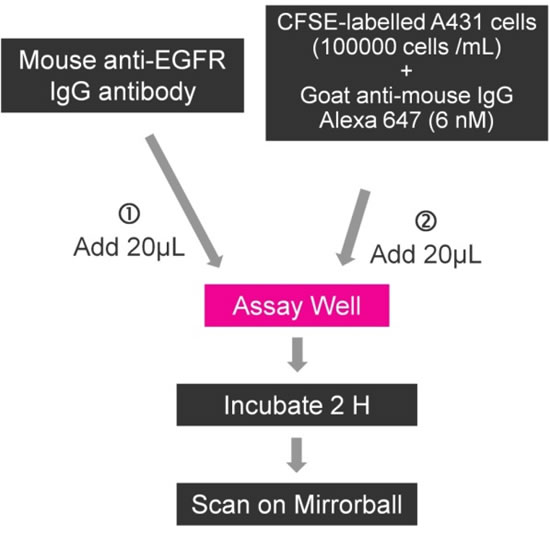 圖1. Mirrorball表皮生長因子受體檢測示意圖。ABI 8200的實驗protocol基本一致,除了加入的A431濃度為4 X 105細胞/ ml。