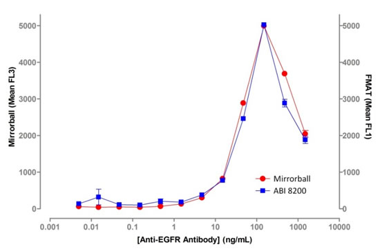 在這項研究中,比較了Mirrorball和ABI8200系統(tǒng)在進行A431細胞EGFR抗體結合實驗時的。 A431細胞在EMEM培養(yǎng)(EBSS)(Sigma公司)含10%胎牛血清,2mM谷氨酰胺(Sigma公司),1X非必需氨基酸(NEAA)(Sigma)和100 U / mL青霉素以及100 U / ml鏈霉素。 A431細胞培養(yǎng)至80%匯合度時用0.25%胰蛋白酶和EDTA收集,洗凈懸浮在培養(yǎng)基中。除非另有說明,培養(yǎng)試劑均購自Life Technology。