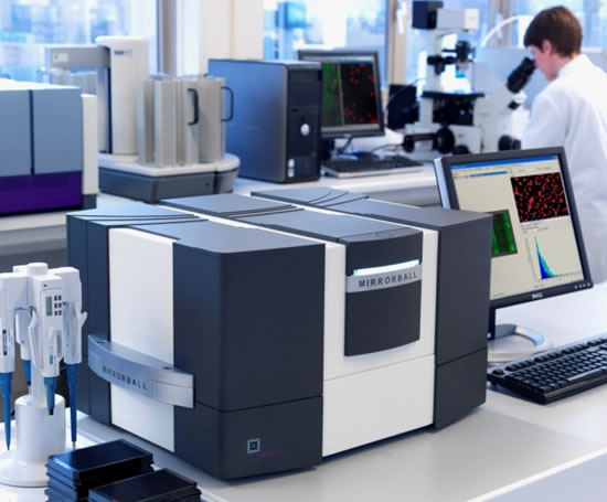 Mirrorball是第一臺能夠完成多重激光同時掃描的儀器,能夠同時將不同熒光關聯(lián)起來。當使用不同的熒光染料的時候,特別是應用在抗體篩選的實驗時候,這種特性就能提供卓越的多重熒光的檢測能力,包括同時檢測多種抗原或者同時檢測不同標記的細胞表面抗原的能力(例如,野生型和轉基因細胞系)。