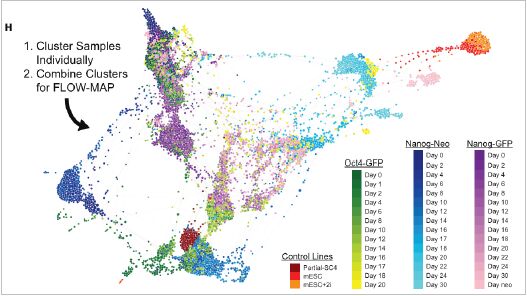 利用細(xì)胞Barcorde技術(shù),Zunder利用一次實(shí)驗(yàn)就可以探索整個(gè)生物系統(tǒng)對(duì)多重刺激的反應(yīng)。他可以同時(shí)測(cè)量細(xì)胞重編程過(guò)程中近乎無(wú)限的數(shù)據(jù)點(diǎn),檢測(cè)的參數(shù)包括細(xì)胞內(nèi)信號(hào)通路、轉(zhuǎn)錄因子網(wǎng)絡(luò)以及細(xì)胞表面Marker等。通過(guò)分析這些數(shù)據(jù)Zunder找到了重編程過(guò)程中可以做為“路標(biāo)”的蛋白分子,把這些“路標(biāo)”和其對(duì)應(yīng)的時(shí)間點(diǎn)相聯(lián)系,就能以空前的精細(xì)度展現(xiàn)細(xì)胞群體隨時(shí)間的變化;诖耍琙under發(fā)現(xiàn)了細(xì)胞重編程過(guò)程中一個(gè)重要的早期中間階段。