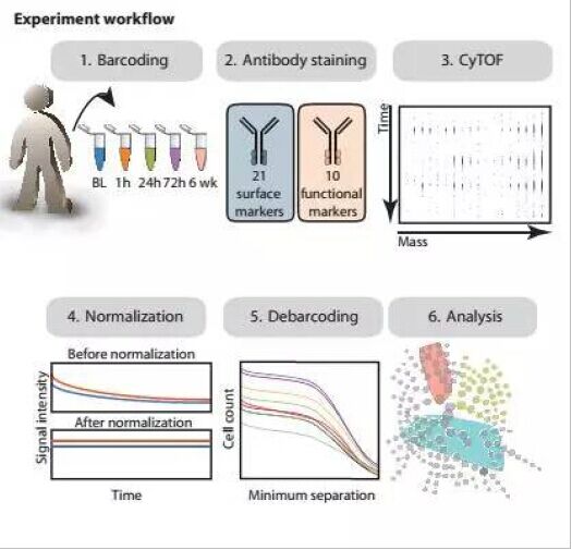 在其他工作人員的幫助下,Zunder優(yōu)化了基于金屬標(biāo)簽的“細(xì)胞Barcorde”(Mass-tag cell barcording)技術(shù)!凹(xì)胞Barcorde”讓不同樣本的細(xì)胞帶上不同的金屬標(biāo)簽,使研究者可以將多個(gè)樣本混合為一管分析,簡(jiǎn)化了樣本制備的操作的同時(shí),也消除了由于染色和數(shù)據(jù)收集過(guò)程中產(chǎn)生的誤差。這樣做不僅節(jié)約了時(shí)間,也使研究者獲得更精確的數(shù)據(jù),這一點(diǎn)在Zunder開(kāi)展的這種大型實(shí)驗(yàn)項(xiàng)目中顯得尤其重要。