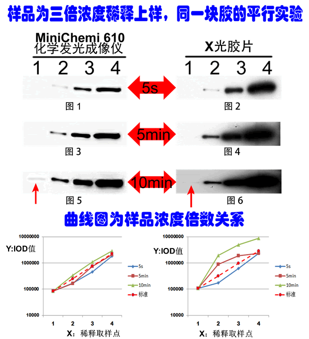 1、化學(xué)發(fā)光成像儀具有靈敏度高、線性好和抑制過曝等優(yōu)點(見圖5、6都是在10分鐘捕獲第一個條帶,且前面的強信號不會過曝),更有利于后期定量分析。