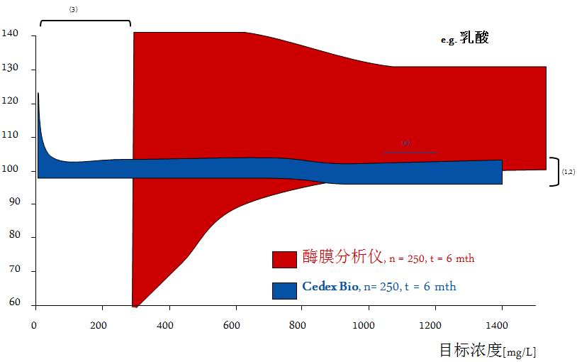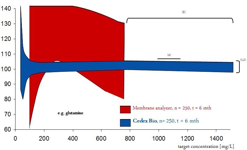 利用相同的參考標(biāo)準(zhǔn)(參見圖1中的血糖、乳酸和谷氨酰胺),將Cedex Bio生物過程分析儀與采用酶膜技術(shù)的成熟儀器進(jìn)行了對比。日間平行對照實驗結(jié)果表明,Cedex Bio生物過程分析儀具備更佳的準(zhǔn)確性和線性。
