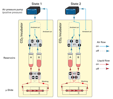 ibidi流體剪切力系統(tǒng)包括兩個主要的部分(圖3):產(chǎn)生空氣壓力的ibidi 泵(電腦控制)和便攜式的流體單元(兩個培養(yǎng)液儲液池、μ-Slide固定裝置和流動管道)。ibidi流體剪切力系統(tǒng)通過泵控制流速、剪切力大小等參數(shù),并通過流體單元兩個閥門的開、關(guān)狀態(tài)實現(xiàn)細胞培養(yǎng)液在兩個儲液池中自循環(huán)(工作原理見圖4),進而只需要極少量的細胞培養(yǎng)液就可以進行長時程的細胞培養(yǎng),少量的培養(yǎng)液也便于分析細胞產(chǎn)生的可溶性因子的變化。通過單個流體單元即可以實現(xiàn)細胞培養(yǎng)液的單方向流動,兩個流體單元配合則可以實現(xiàn)細胞培養(yǎng)液的脈沖式流動或者振蕩式流動。便攜式的流體單元可以方便的與pump進行連接以及去連接,使得在超凈臺中對流體單元進行操作變得簡單,例如向儲液池中加入培養(yǎng)液以及連接培養(yǎng)細胞的載玻片等。準(zhǔn)備就緒后,流體單元放入細胞培養(yǎng)箱,與pump進行氣路以及電路的連接,便可以進行流體剪切力狀態(tài)下的細胞培養(yǎng)了。流體單元也可以放在顯微鏡附近,方便進行活細胞觀察成像。