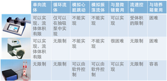 為什么要選擇ibidi流體剪切力系統(tǒng)?ibidi流體剪切力系統(tǒng)與其他方法相比有哪些優(yōu)勢呢(見圖7)?首先,注射泵與蠕動泵不易與培養(yǎng)箱配套使用;不能產(chǎn)生脈沖式以及振蕩式的液體流動。而且蠕動泵放置在細胞培養(yǎng)箱中會產(chǎn)生過多的熱量,不利于細胞培養(yǎng)。另外,蠕動泵擠壓管道的壓力會施加到細胞上,進而可能損傷細胞或者導(dǎo)致細胞的非特異性激活。ibidi流體剪切力系統(tǒng)采用空氣壓力,使培養(yǎng)液交替的從一個儲液池泵到另一個儲液池中,形成一個無菌密閉的循環(huán)系統(tǒng);可以輕松的實現(xiàn)單方向的、振蕩式的以及脈沖式的液體流動,進而可以模擬所有生理狀態(tài)下的液體流動狀態(tài)。