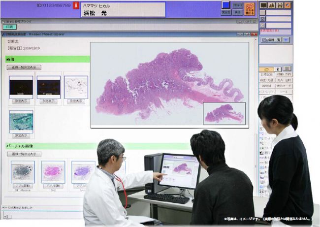 (醫(yī)院方面)突然提出想要建立互聯(lián)的電子病歷系統(tǒng),其實是很困難的。過程中非常重要的一點,是一定要得到醫(yī)療信息部醫(yī)生們的理解和協(xié)助。這次通過電子病歷版本的升級,互聯(lián)終于得以實現(xiàn)。雖然引入NanoZoomer數(shù)字病理裝置已有幾年了,但在此之前的臨床病理會議,也只是將數(shù)字切片圖像放到電腦上來進行報告,而臨床的醫(yī)生也會詢問“什么時候也能讓我們看看數(shù)字切片圖像?”,這種期待也是一種很大的動力,F(xiàn)在,即使不帶自己的PC,甚至不帶任何其他東西,只要在各科室內(nèi)通過電子病歷的終端連接到投影儀,就可以清晰地看到病理切片了。
