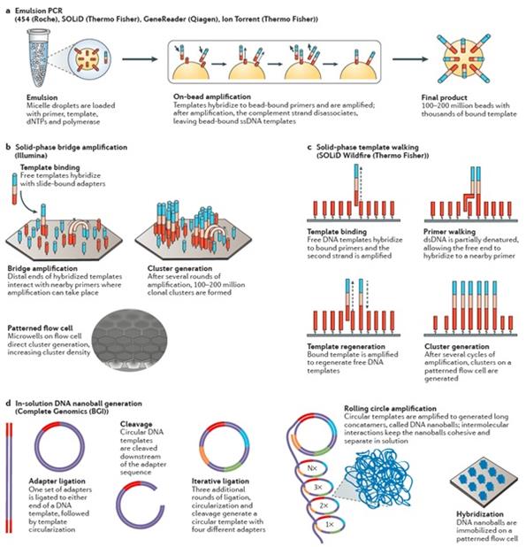 產(chǎn)生模板的克隆有幾個方法:基于磁珠(bead-based),固相介質(zhì)(solid-state)以及DNA微球技術(shù)(DNA nanoball)(圖1)。DNA模板產(chǎn)生的第一步就是樣本DNA的片段化,接著是連接到一個為了克隆和測序而設(shè)計的接頭上。在磁珠法的準(zhǔn)備過程中,一個接頭和寡核糖核酸片段互補并且固定在珠子上(圖1a)。DNA模板通過使用油包水PCR(emulsion PCR,emPCR)8得以擴增。單個珠子上被克隆得到的DNA片段可以達到上百萬個9。這些珠子可以被分為glass surface10或者PicoTiterPlate(羅氏診斷)11。固相介質(zhì)擴增12避免了油包水PCR,取而代之的是在固相介質(zhì)上直接進行PCR13(圖1b,c)。該方法中,正向和反向引物結(jié)合在芯片的表面,這些引物給單鏈DNA(single-stranded DNA,ssDNA)提供了末端的互補序列供其結(jié)合。最近,幾個NGS的平臺都是用了模塊化的flow cells。