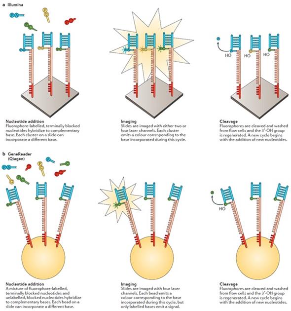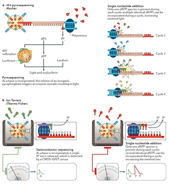 第一個NGS儀器是454焦磷酸測序儀24。這種SNA系統(tǒng)將結(jié)合有模板的珠子以及酶混合物分配到PicoTiterPlate中。由于一個dNTP只能結(jié)合到一條鏈上,酶復(fù)合物會對其產(chǎn)生生物熒光。一個特定的珠子中的一個或多個dNTPs可以通過電荷共軛偶聯(lián)設(shè)備(charge-coupled device, CCD)檢測到的熒光來確認(rèn)(圖4a)。