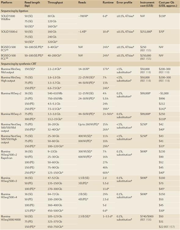 SNPs35,39,40。在對所有的可能性都進行優(yōu)化之后,Illumina平臺被大量的研究人員認(rèn)可,在大量的領(lǐng)域中均有涉及:WGS的基因組測序與外顯子測序;遺傳學(xué)應(yīng)用如染色質(zhì)免疫共沉淀——測序(chromatin immunoprecipitation followed by sequencing)41;ATAC-Seq(transposase-accessible chromatin using sequencing)42或者DNA甲基化測序(Methyl-Seq)43;RNA轉(zhuǎn)錄組測序(transcriptomics applications through RNA sequencing, RNA-seq)44等等。NextSeq與MiniDeq平臺使用的雙色標(biāo)記系統(tǒng)通過降低雙色通道的掃描與熒光基團的使用達到成本并且增加測序速度。然而,雙通道系統(tǒng)卻會略微增加測序的錯誤率45。HiSeq X是目前最高通量的儀器,但其由于通量過大,因此只在部分應(yīng)用上得以使用,如WGS與全基因組甲基化測序。不僅如此,HiSeq X更大的局限在于其高昂的成本,以至于超過了絕大多數(shù)單位的可接受程度。