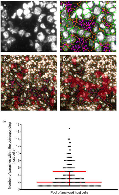 此圖為寄生負(fù)載的評(píng)估。(A)被感染的淋巴腺。灰階圖為DAPI+宿主細(xì)胞核和寄生蟲(chóng)DNA。(B)胞核,胞漿和寄生蟲(chóng)的重疊影像(C)(D)反向回溯擁有3和5-10寄生蟲(chóng)的細(xì)胞(E)感染細(xì)胞的寄生負(fù)載。