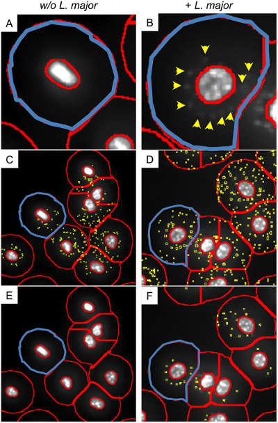 根據(jù)活性病原體的微弱DAPI信號(hào)和復(fù)雜的背景信息,新型的運(yùn)算法需要從中識(shí)別病原體。每種獨(dú)立的運(yùn)算法不可能同時(shí)滿足所有的實(shí)驗(yàn)需要。Parasite finder預(yù)設(shè)程序可根據(jù)用戶需要選擇方法最高程度的區(qū)別背景與待分析部分。(A)ring mask圈出胞質(zhì)部分,代表缺少病原體培養(yǎng)的條件下的巨噬細(xì)胞。(B)藍(lán)色部分為感染的巨噬細(xì)胞的ring mask,黃色箭頭標(biāo)出DAPI的陽(yáng)性信號(hào)。(C)舉例說(shuō)明的運(yùn)算法用來(lái)檢測(cè)微弱信號(hào)區(qū)別沒(méi)有被感染的巨噬細(xì)胞的ring mask中的偽信號(hào)。(黃色部分)(D)創(chuàng)建偽陽(yáng)性信號(hào)。多于30個(gè)病原體的巨噬細(xì)胞被藍(lán)色標(biāo)出。(E)檢測(cè)微弱信號(hào)區(qū)分沒(méi)有被感染的巨噬細(xì)胞的ring mask中的非偽信號(hào)。(F)所有被感染的巨噬細(xì)胞(黃色部分和黃色箭頭)均被識(shí)別出。