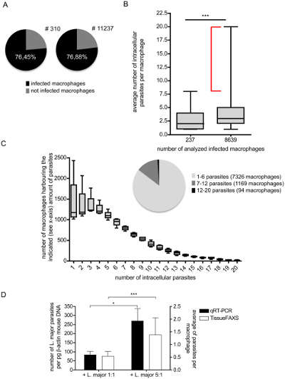 (A)軟件自動(dòng)計(jì)算感染與未感染的巨噬細(xì)胞。(B)每個(gè)巨噬細(xì)胞胞內(nèi)寄生蟲(chóng)的平均數(shù)量的定量分析。在分析了237個(gè)與8639個(gè)細(xì)胞后,得出隨即選擇的樣本足以證明總感染比例的正確性。(C)胞內(nèi)寄生蟲(chóng)與巨噬細(xì)胞的關(guān)系。胞內(nèi)病原體的數(shù)量和Y軸相應(yīng)的病原體對(duì)應(yīng)的巨噬細(xì)胞擁有病原體的數(shù)量區(qū)間。