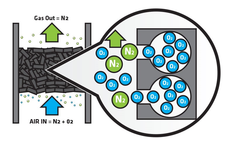 變壓吸附技術(shù)是通過固體介質(zhì)來分離氣體混合物中的單一組分,用變壓吸附技術(shù)來分離空氣中的氮?dú),所需的固體介質(zhì)是碳分子篩,碳分子篩對(duì)空氣中的氧氣選擇性吸附,從而在加壓的情況下分離了空氣中的氮?dú)夂脱鯕狻?/p>