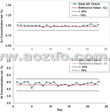 分析結(jié)果平均精度Cu 0.993±0.018 %(1.9% RSD)和Al 4.38±0.12 %(2.7% RSD),該圖還說明測(cè)量值基本在參考值±10%的范圍。在23天的時(shí)間里銅和鋁的總體準(zhǔn)確度分別是+1.7 %BIAS和+1.9 %BIAS。