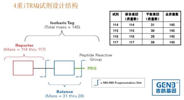 iTRAQ試劑由三部分組成:報(bào)告基團(tuán)(Report Group),平衡基團(tuán)(Balance Group)和肽反應(yīng)基團(tuán)(Peptide Reactive Group)。肽反應(yīng)基團(tuán)可與肽段N-端或賴(lài)氨酸側(cè)鏈發(fā)生反應(yīng)形成共價(jià)鍵從而完成對(duì)肽段的標(biāo)記。”