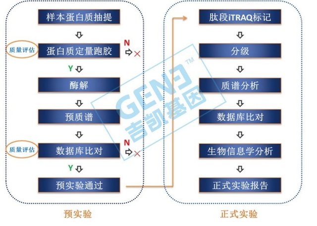 “iTRAQ實(shí)驗(yàn)流程:分為預(yù)備實(shí)驗(yàn)和正式實(shí)驗(yàn)兩部分(見(jiàn)下圖)。預(yù)備實(shí)驗(yàn)中蛋白質(zhì)定量跑膠以及預(yù)質(zhì)譜數(shù)據(jù)庫(kù)比對(duì)結(jié)果為重要質(zhì)量控制點(diǎn),其目的在于質(zhì)控和評(píng)價(jià)蛋白質(zhì)質(zhì)量和樣本間的蛋白表達(dá)譜平行性、蛋白質(zhì)總量和濃度以及查詢(xún)的蛋白質(zhì)序列數(shù)據(jù)庫(kù)選取是否合理。正式實(shí)驗(yàn)是在預(yù)備實(shí)驗(yàn)的基礎(chǔ)上進(jìn)行, LC-MS/MS串聯(lián)質(zhì)譜中,一級(jí)質(zhì)譜時(shí),平衡基團(tuán)可以確保無(wú)論用哪種報(bào)告離子標(biāo)記的肽段都顯示為相同的荷質(zhì)比,這樣一來(lái),不同來(lái)源的相同肽段在此時(shí)都表現(xiàn)為一個(gè)峰;在二級(jí)質(zhì)譜時(shí),iTRAQ試劑中的平衡基團(tuán)發(fā)生中性丟失,信號(hào)離子表現(xiàn)為不同質(zhì)荷比的峰,因此根據(jù)波峰的高度及面積,可以得到同一蛋白在不同樣本中的表達(dá)差異;同時(shí),肽段的MS/MS結(jié)果結(jié)合數(shù)據(jù)庫(kù)檢索可以鑒定出相應(yīng)的蛋白種類(lèi)。”