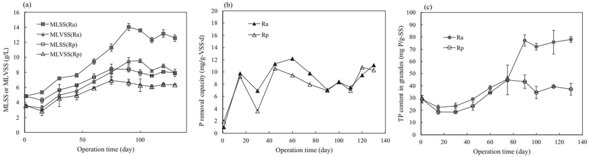 2、Fig 2a顯示,乙酸鹽較丙酸鹽更容易被吸收,隨著時(shí)間的增加,兩組的MLSS和MLVSS 濃度也在不斷的增加。到了第90天,兩組的生物量都有所下降,然后趨于平衡。Rp組,Ra組的MLVSS/MLSS比值較低,顯示Ra組中的礦物質(zhì)沉淀較多。Fig 2b顯示,從15天到90天,Ra組的磷去除能力較Rp組要顯著增高,但是從第90天后,該趨勢逐漸變小。Fig 2c顯示Ra組中總磷的含量較Rp組顯著提高。