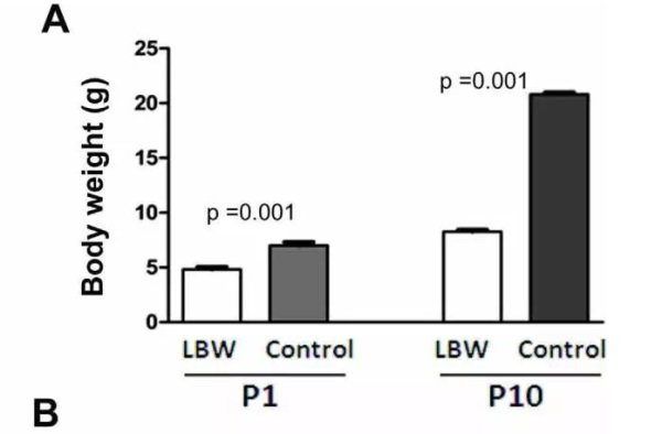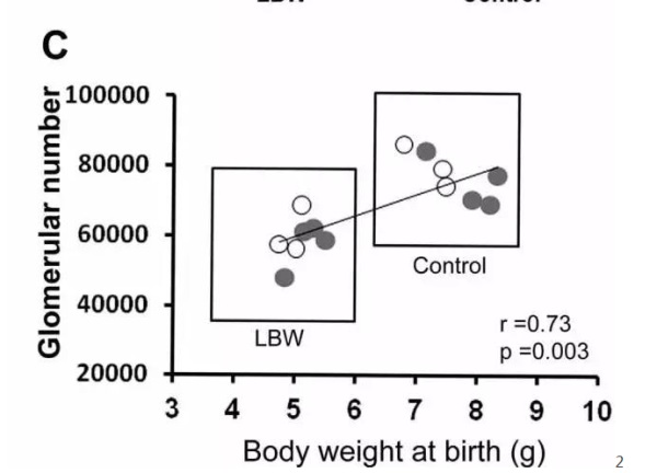 研究人員首先建立了低蛋白喂育懷孕大鼠的模型,誘導(dǎo)產(chǎn)生由于缺少蛋白而導(dǎo)致宮內(nèi)發(fā)育受限產(chǎn)生低體重兒。檢測(cè)結(jié)果顯示,模型條件下出生的雄性大鼠出生后10天的體重明顯低于正常對(duì)照。同時(shí),腎臟腎小球的數(shù)量也顯著降低。
