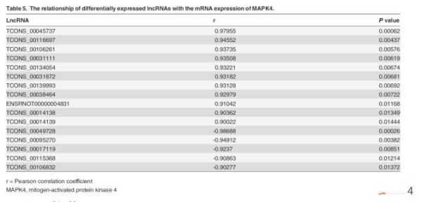 為了驗(yàn)證芯片篩選到的差異lncRNA是否真實(shí)可靠,研究人員對(duì)于MAPK4相關(guān)的lncRNA中隨機(jī)選擇了4個(gè)下調(diào)和1個(gè)上調(diào)進(jìn)行RT-PCR驗(yàn)證。結(jié)果顯示,3個(gè)lncRNA的結(jié)果與芯片結(jié)果一致。