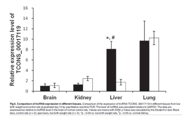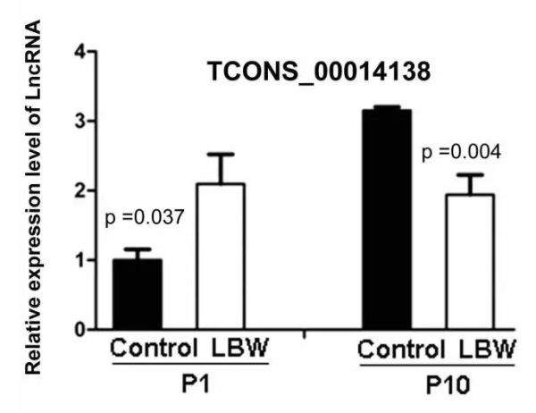 為了探究這些差異表達(dá)lncRNA是否是腎臟特異性表達(dá)的,研究人員對(duì)LBW和對(duì)照組p10大鼠的不同器官組織(腎,肝,腦和肺)進(jìn)行了檢測(cè)。結(jié)果顯示,TCONS_0014139在肝腦肺中表達(dá)很低,只在腎中表達(dá)。而TCONS_00014138在正常肝和肺中也能檢測(cè)到,LBW組和正常組也沒(méi)有明顯差異。TCONS_00017119在肝中比腎中表達(dá)高,而在LBW組肝中的表達(dá)低于正常組,而肺中沒(méi)有明顯區(qū)別。因此,在LBW大鼠中,確實(shí)存在著一類表達(dá)與腎臟密切相關(guān)的特異性lncRNA。