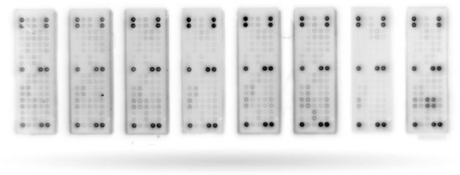 抗體陣列印跡膜與夾心式ELISA類似,將樣品加到膜上,蛋白與抗體特異性結(jié)合從而被捕獲,之后利用被標(biāo)記的二抗進(jìn)行檢測。下述圖像為使用化學(xué)發(fā)光成像結(jié)果。