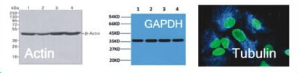 actin即肌動(dòng)蛋白,是細(xì)胞的一種重要骨架蛋白。actin大致可分為六種,其中四種是不同肌肉組織特異性的,包括alpha-skeletal muscle actin、alpha-cardiac muscle actin、alpha-smooth muscle actin和gamma-smooth muscle actin,其余兩種廣泛分布于各種組織中,包括beta-actin (β- non-muscle)和gamma-non-muscle actin。這些不同的亞型組織分布是不一樣的,在肌肉組織中的beta-actin分布就很少,心肌主要是alpha-cardiac muscle actin。因此不同的組織本來就應(yīng)該選擇不同的內(nèi)參,不能一概而論的。beta-actin作為內(nèi)參是得到了公認(rèn)的,這是針對(duì)大多數(shù)組織和細(xì)胞來說的,它廣泛分布于細(xì)胞漿內(nèi),表達(dá)量非常豐富。GAPDH (甘油醛-3-磷酸脫氫酶) 是參與糖酵解的一種關(guān)鍵酶,而tubulin和actin類似,是細(xì)胞骨架的組成部分,但是不是肌肉的主要成分,應(yīng)該是一個(gè)代替品。三種同時(shí)發(fā)生變化的情況很少,需要具體分析。一旦出現(xiàn)上述三種內(nèi)參同時(shí)發(fā)生變化,如果是總蛋白可以用胞核的內(nèi)參如PCNA,TATA-box bingding protein (TBP) 甚至線粒體的內(nèi)參來代替,當(dāng)然一般這種可能性出現(xiàn)的幾率微乎其微。