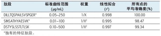 表2. 用于定量大鼠血漿中英夫利昔單抗的特征肽段的線性動(dòng)態(tài)范圍和標(biāo)準(zhǔn)曲線統(tǒng)計(jì)數(shù)據(jù)。