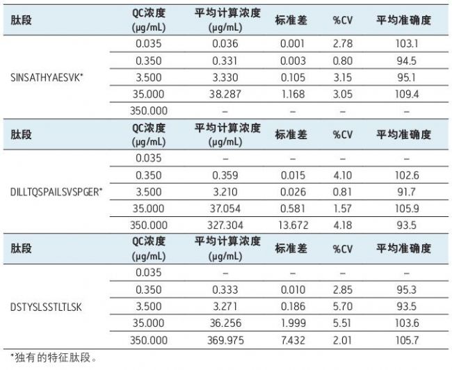 表3. 用于定量的所有英夫利昔單抗肽段QC 樣品的統(tǒng)計(jì)數(shù)據(jù)。
