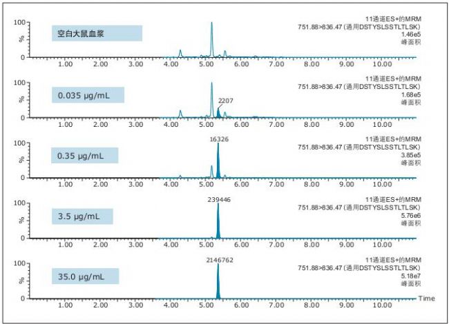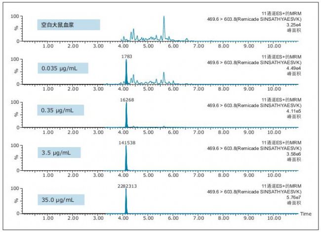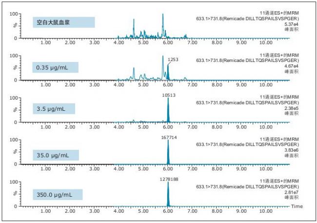 首先使用蛋白A 瓊脂糖基96孔板對(duì)35 µL大鼠血漿中的英夫利昔單抗進(jìn)行免疫純化。然后使用ProteinWorks eXpress 酶解套裝和方案處理樣品以用于LC-MS分析。最后使用ProteinWorks µElution SPE 凈化試劑盒和方案純化特征肽段。