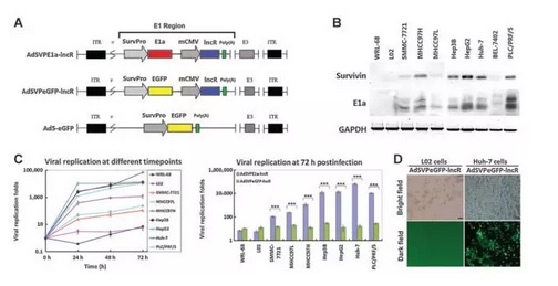 為了同時干預多個OncomiRs,研究人員腺病毒載體構(gòu)建了同時能靶向12個miRNA(miR21,miR221/222,miR224,miR17-5p/20a,miR10b,miR106b,miR151-5p,miR155,miR181a/181b,miR184,miR1和miR501-5p),AdSVPE1a-lncR。結(jié)果顯示,在HepG2,Hep3B,MHCC97H,Huh-7和PLC/PRF /5細胞系中都能表達,而在正常肝細胞系WRL-68和L02中不能表達。HepG2, Hep3B,MHCC97H, Huh-7, PLC/PRF/5 SMMC-7721, MHCC97L細胞中能檢測到高的E1a表達,而在BEL-7402, WRL-68, L02細胞中表達很弱。在SMMC-7721和MHCC97L細胞中,AdSVPE1a-lncR的復制水平有成百倍,而在正常細胞系L02和WRL-68中復制水平很低。因此,研究人員成功的將lncRNAi體系在HCC細胞系中實現(xiàn)了表達。